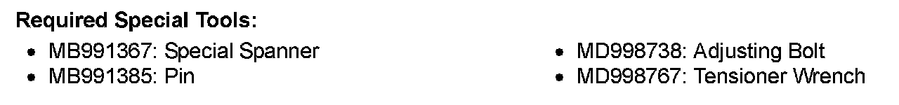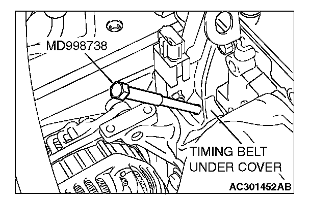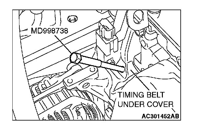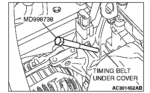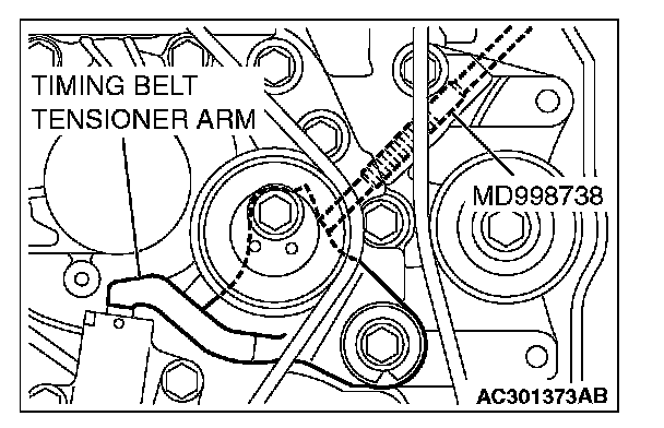CAUTION: Special tool MD998738 can be gradually installed at a rate of a 30 degree turn per second. If it is screwed in all at once, the timing belt tensioner adjuster rod will not easily retract and special tool MD998738 may bend.