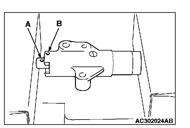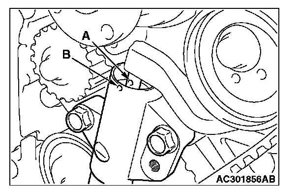 4. Gradually screw in special tool MD998738 and then align the timing belt tensioner adjuster rod set hole A with the timing belt tensioner adjuster cylinder set hole B.