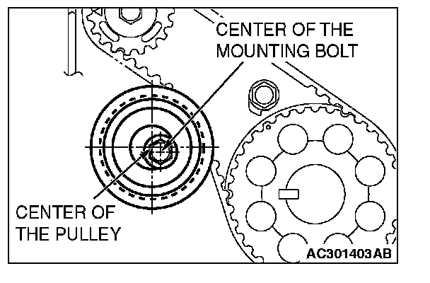 CAUTION: When tightening the mounting bolt, ensure that the timing belt tensioner pulley does not rotate with the bolt. Allowing it to rotate with the bolt can cause deficient tension of the belt.