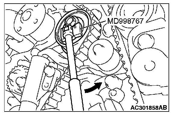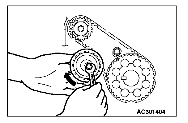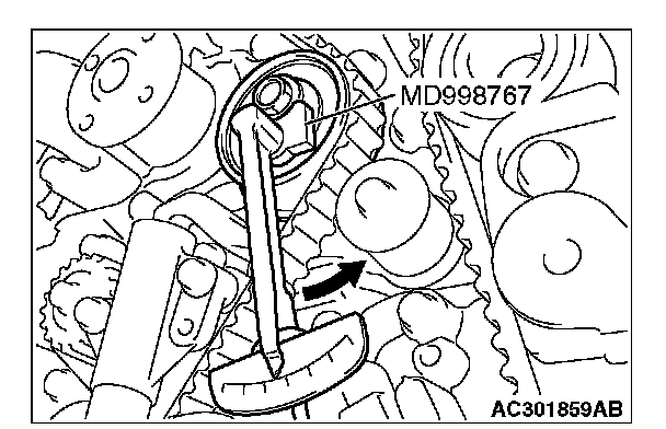 4. Turn the timing belt tensioner pulley in the direction shown in the figure using special tool MD998767 to apply tension to the valve timing belt. Then temporarily tighten and fix the timing belt tensioner pulley mounting bolt.