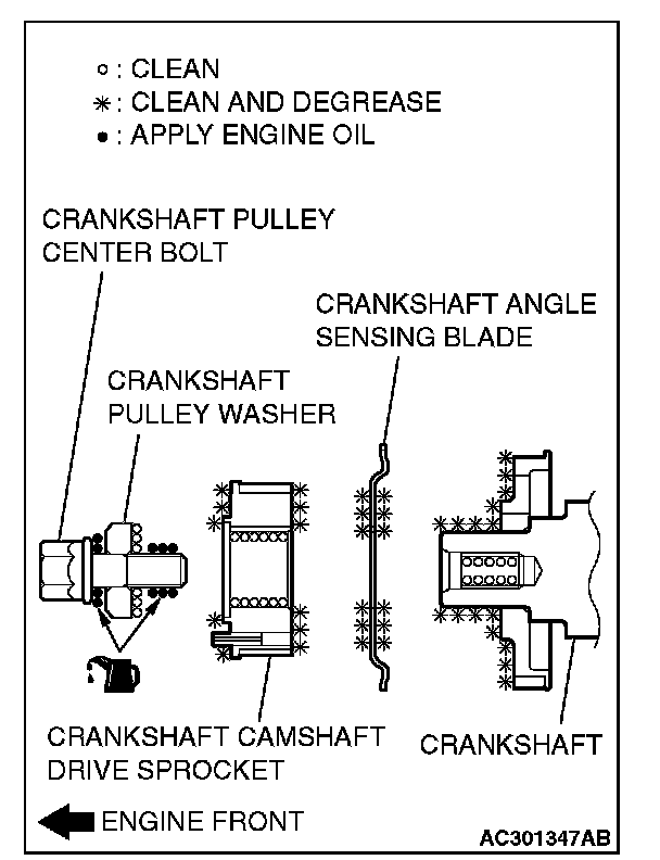 1. Clean or degrease the crankshaft, the crankshaft angle sensing blade, the crankshaft camshaft drive sprocket and crankshaft pulley washer as shown.