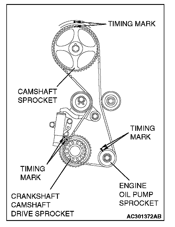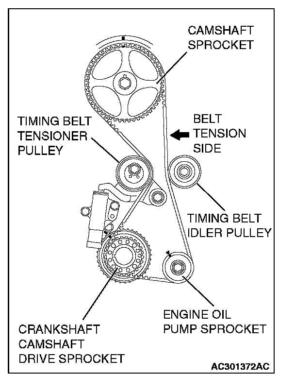 CAUTION: Incorporate the valve timing belt. Then apply reverse rotation (counterclockwise rotation) pressure to the cam shaft sprocket. Re-check to see that each timing mark is aligned while the tension side of the belt is right.