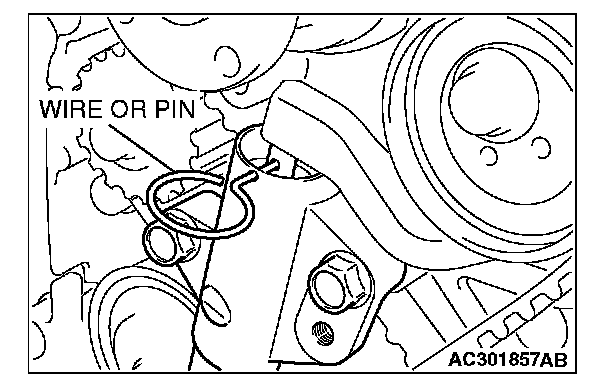 10. Insert wire or pin removed in Step 7 again, and ensure that it can be pulled out with a light load. When wire or pin can be lightly removed, appropriate tension is applied on timing belt. In this case, remove wire or pin.
