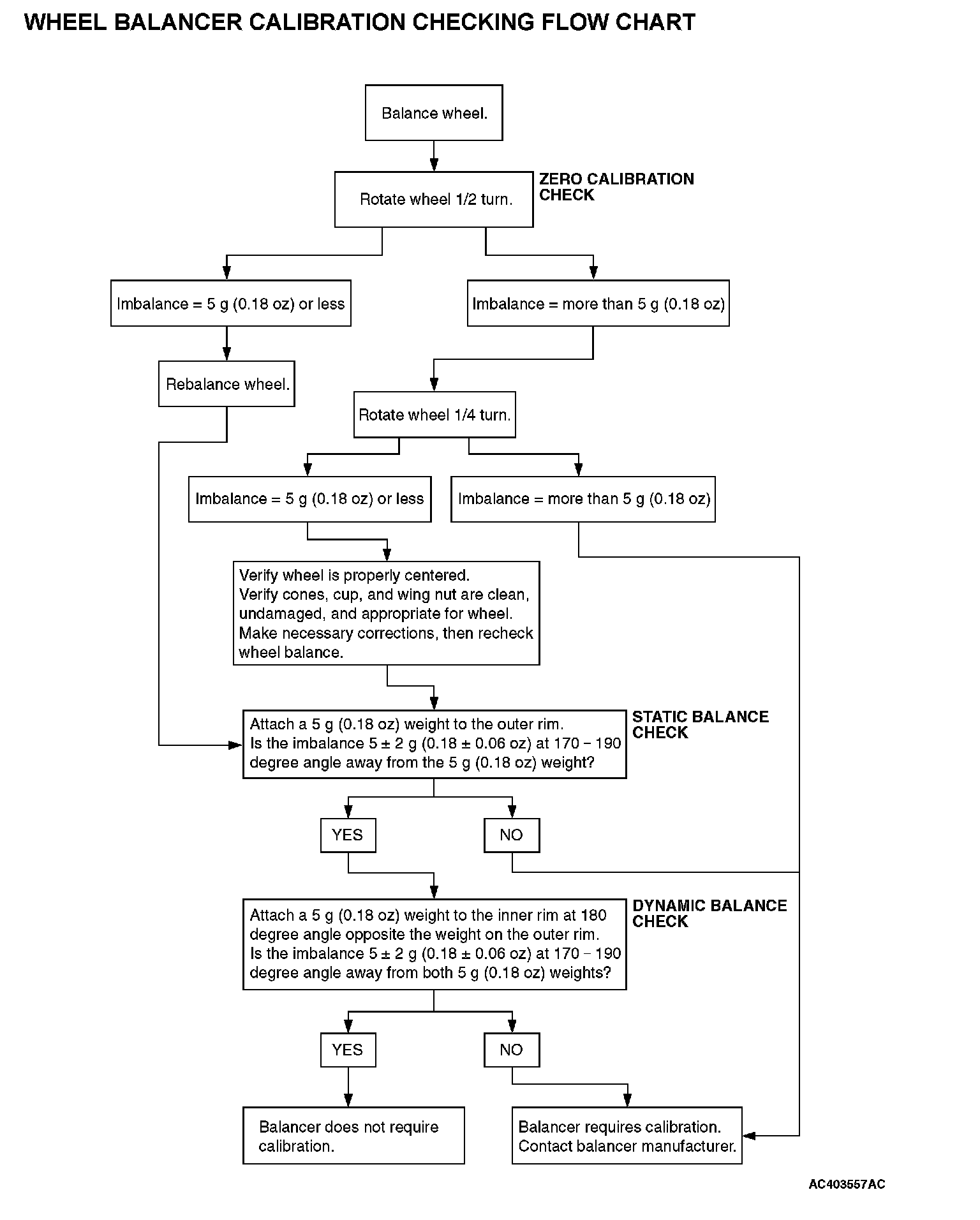 Check your balancer's calibration approximately every 100 balances. Your wheel balancer's instruction manual should include calibration procedures. If the calibration procedures specifically for your balancer are missing, use the generic steps in this section for zero calibration, static balance, and dynamic balance checks. The wheel balancer calibration checks are also described in the flowchart.