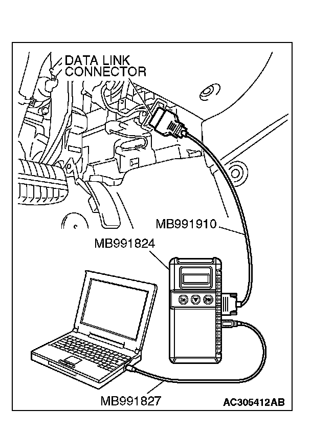 CAUTION: To prevent damage to scan tool MB991958, always turn the ignition switch to the "LOCK" (OFF) position before connecting or disconnecting scan tool MB991958.
