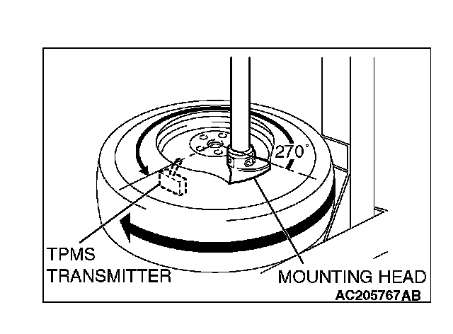 1. Place wheel and tire on turntable of tire mounting machine. Ensure that transmitter is 270 degree angle (3 o'clock position) from mounting head when the outer tire bead is mounted as illustrated.