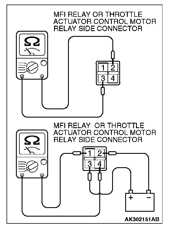MULTIPORT FUEL INJECTION (MFI) RELAY AND THROTTLE ACTUATOR CONTROL MOTOR RELAY CONTINUITY CHECKInspect the MFI relay and throttle actuator control motor relay for continuity in accordance with the chart shown below.