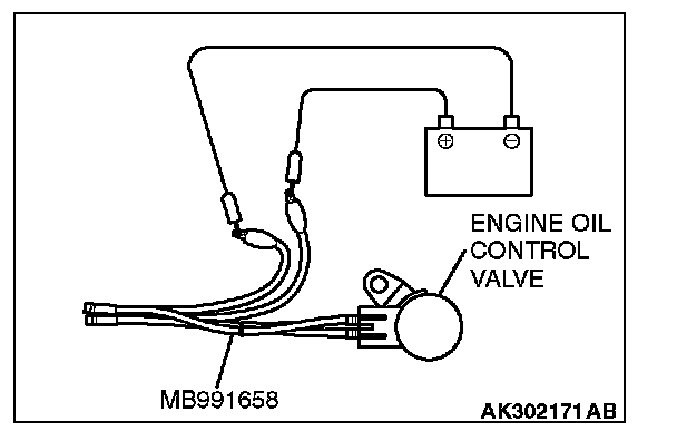 2. Check that the operation sound of the engine oil control valve can be heard when the positive battery voltage is supplied to the engine oil control valve. (Use the jumper wires to connect terminal No. 2 of the engine oil control valve connector to the positive battery terminal and terminal No. 1 to the negative battery terminal.)