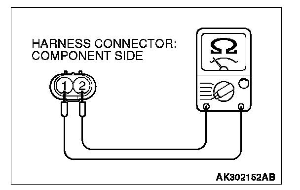 2. Measure resistance between terminal No. 1 and terminal No. 2 of the connector at the engine oil control valve side.