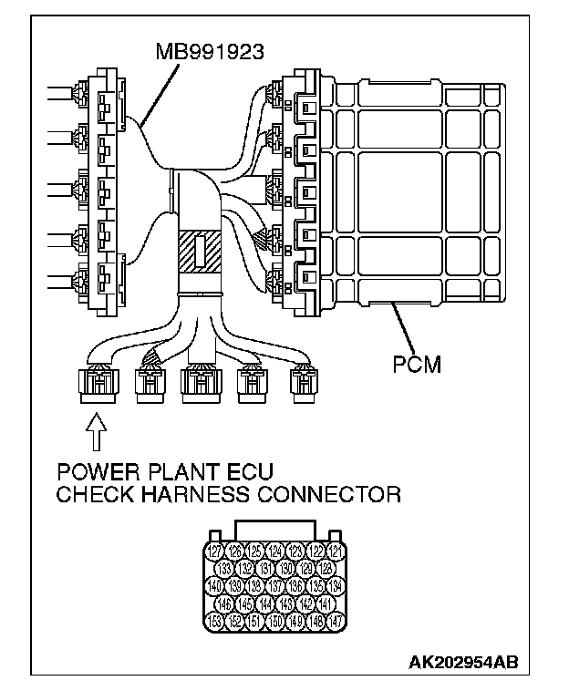 1. Disconnect all PCM connectors. Connect the check harness special tool (MB991923) between the separated connectors.