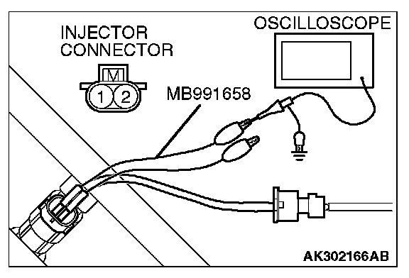 1. Disconnect the injector connector, and connect the test harness special tool (MB991658) between the separated connector. (All terminals should be connected.)