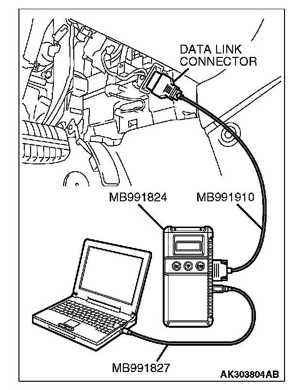 CAUTION: To prevent damage to scan tool MB991958, always turn the ignition switch to the "LOCK" (OFF) position before connecting or disconnecting scan tool MB991958.
