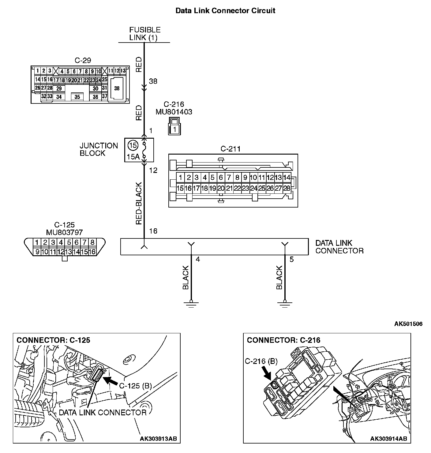 NO: Check harness connectors C-211, C-216 and C-29 at intermediate connector for damage, and repair or replace as required. If intermediate connector C-211, C-216 and C-29 are in good condition, repair an open circuit between fusible link 1. and data link connector C-125 (terminal No. 16). Then confirm that the malfunction symptom is eliminated.