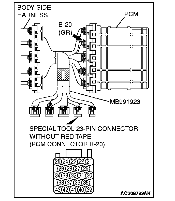 2. Connect special tool MB991923 (check harness) between the PCM and the body-side harness connector.