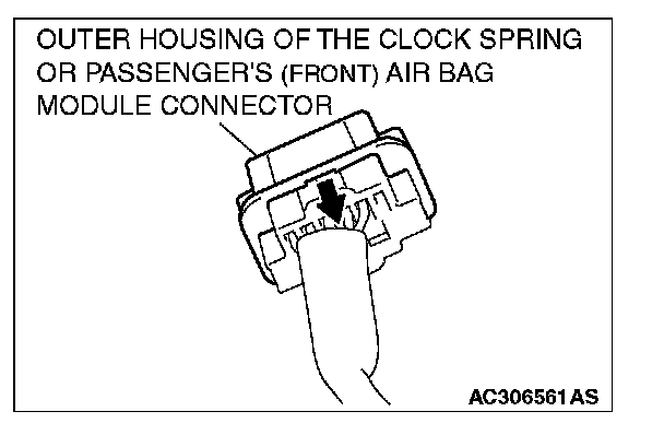 Slide the outer housing of the clock spring or Passenger's (front) air bag module connector in the arrow direction shown, and disconnect the connector.