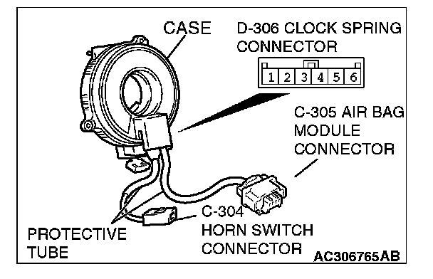 3. Check to see that there is a charge (continuity) between the C-306 clock spring connector terminal 1 and C-304 horn switch.