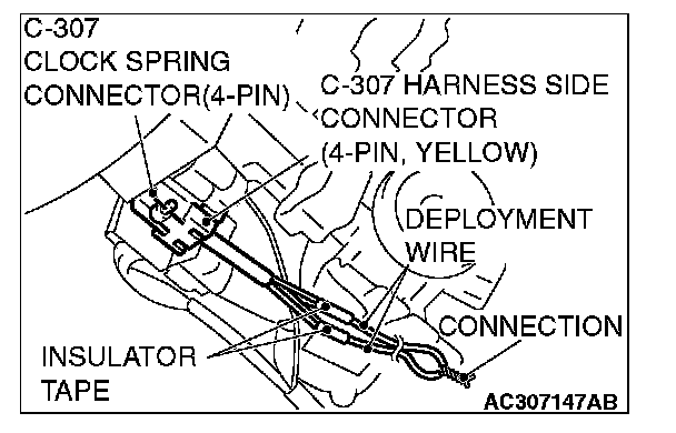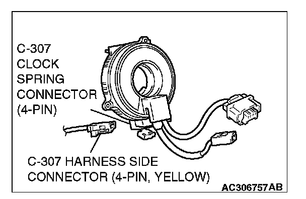 4. Remove the connection between the C-307 clock spring connector (four-pin) and the harness side connector (four-pin, yellow).