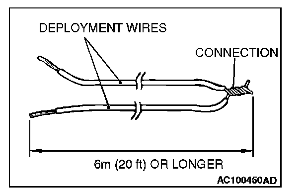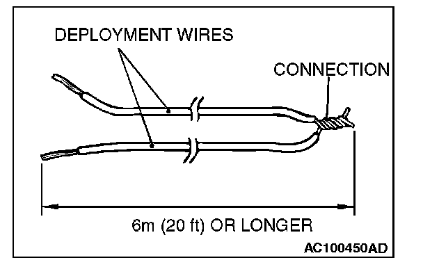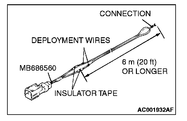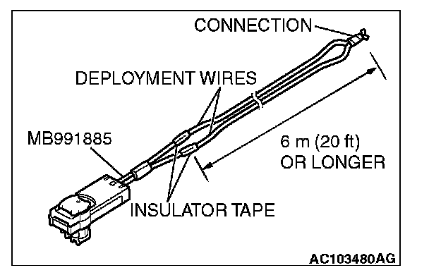 5. Connect deployment wires, each 6 meters (20 feet) or longer, to the two leads of special tool adapter harness (MB991885), and cover the connections with insulator tape. The other ends of the deployment wires should be connected to each other (short-circuited), to prevent sudden unexpected deployment of the air bag module.