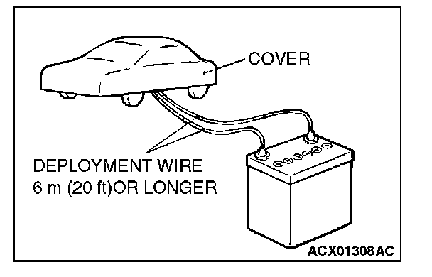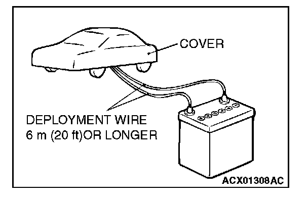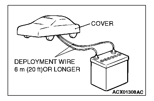 4. Connect deployment wires, each 6 meters (20 feet) or longer, to the two leads of SRS air bag adapter harness (MB686560), and cover the connections with insulator tape. The other ends of the deployment wires should be connected to each other (short-circuited), to prevent sudden unexpected deployment of the air bag module.