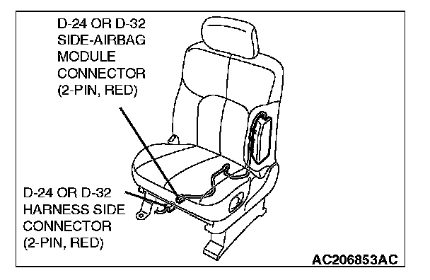 3. Remove the connection between the D-24 or D-32 side-airbag module connector (two-pin, red) and the harness side connector (two-pin, red).