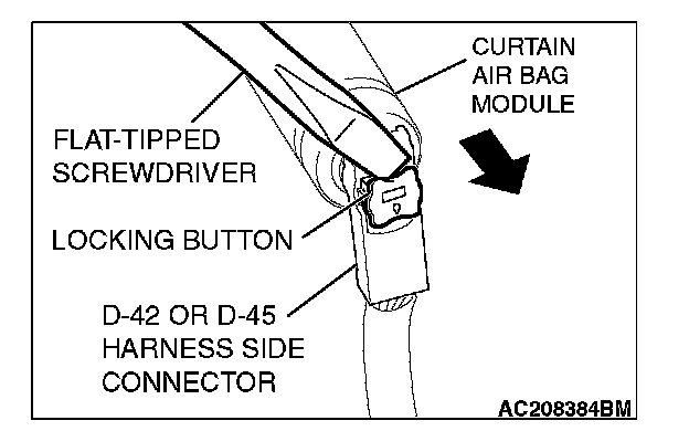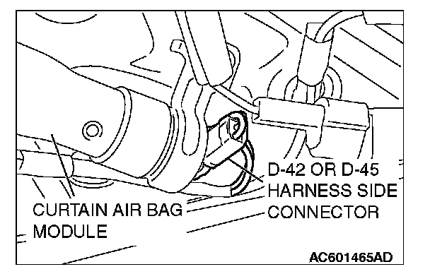 4. Disconnect harness side connector D-42 or D-45 (two-pin, black) from the curtain air bag module.