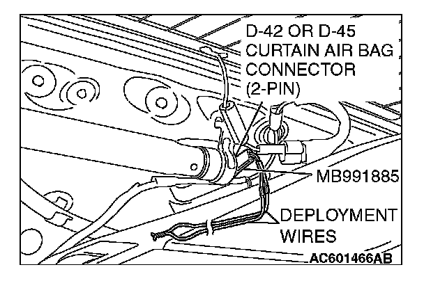6. Connect the D-42 or D-45 curtain air bag module two-pin connector (black) to special tool adapter harness (MB991885), and move the deployment wires out of the vehicle.