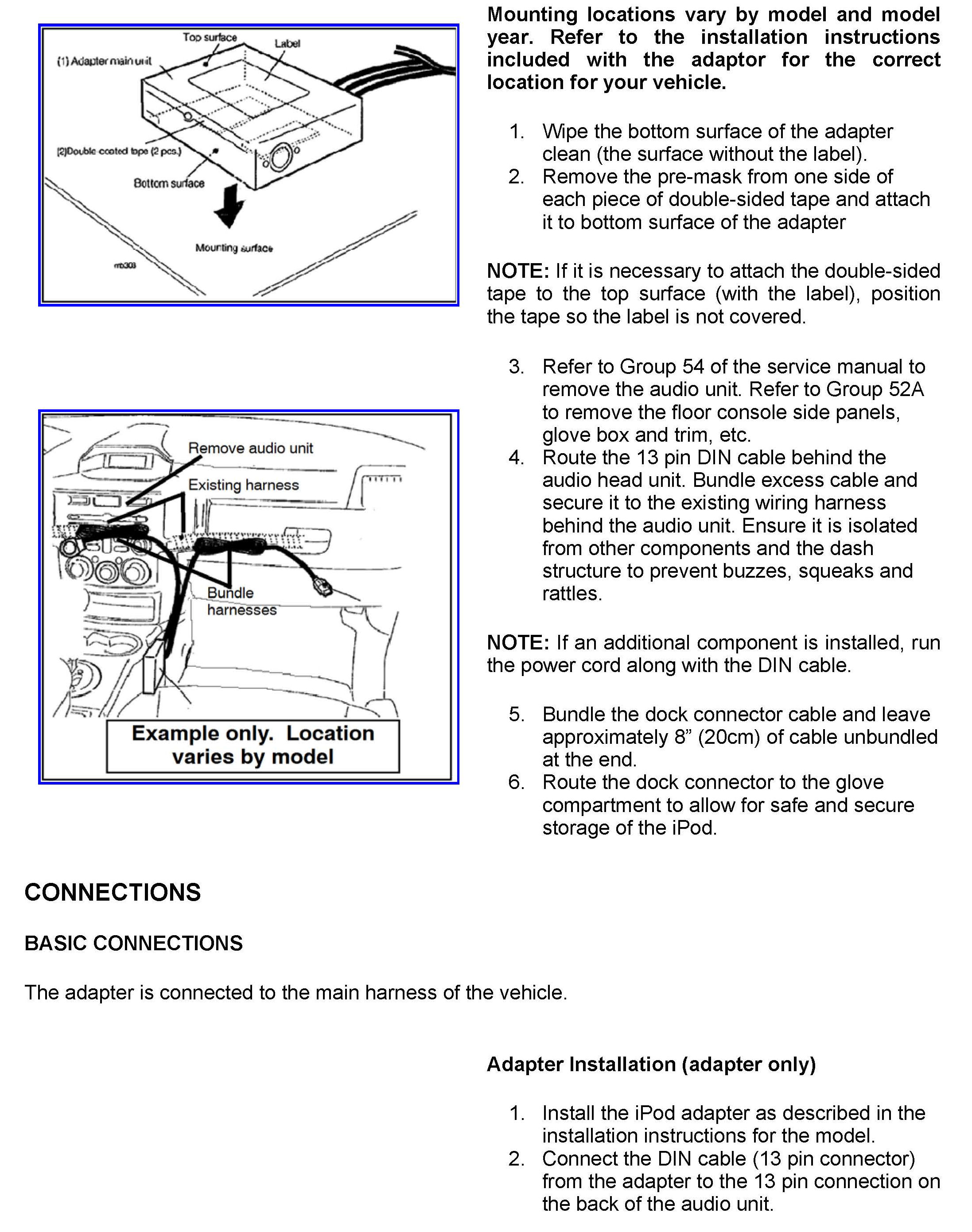 To assist Mitsubishi service technicians in the installation, operation and troubleshooting of the Authorized Mitsubishi Accessory iPod Adapter (p/n MZ607411EX).