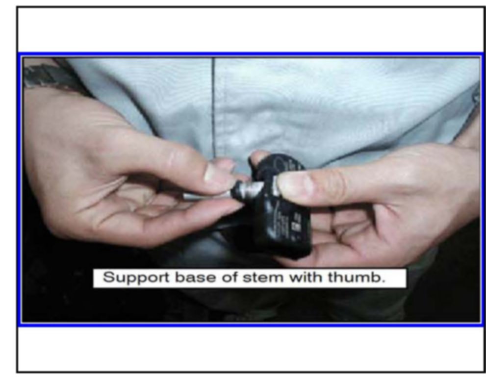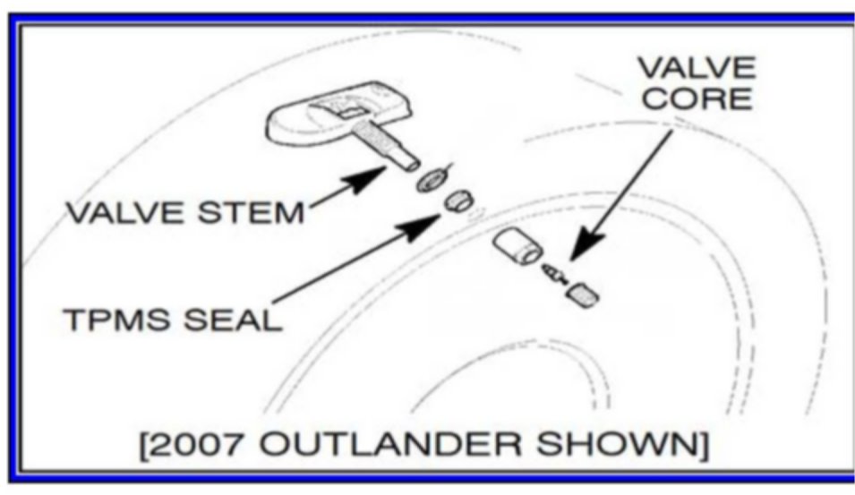 For Outlander and all Lancer models, when installing the TPMS seal and washer, be sure to support the base of the valve stem with your thumb. Applying lateral pressure to an unsupported valve stem can break the antenna base.