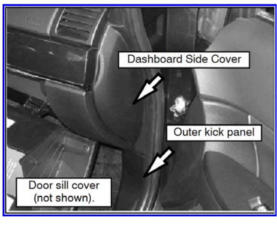 1. Remove the right hand side door sill cover, the right hand side outer kick panel and the right hand dashboard side cover.