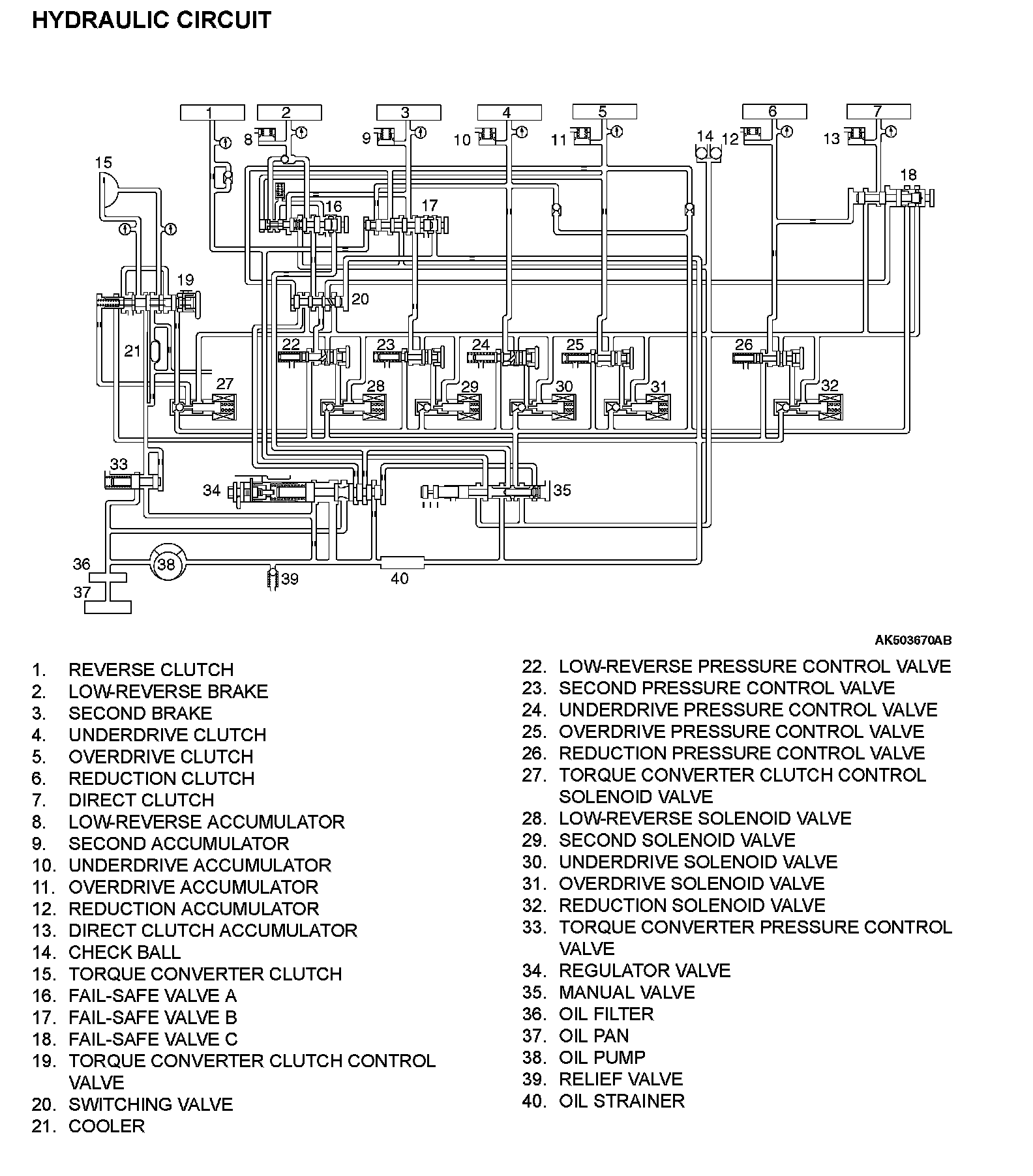 Parts related to oil pressure regulation are the oil pump, which pressurizes the oil; the regulator, which controls the pressure setting; the solenoid valves, which change the oil pressure with electrical signals; the pressure control valve, which controls the oil pressure coming from the solenoid valve that affects each clutch and brake; each kind OD valve, which carry out the retention of the oil pressure through the lines; and finally the valve body, which houses all the valves.
