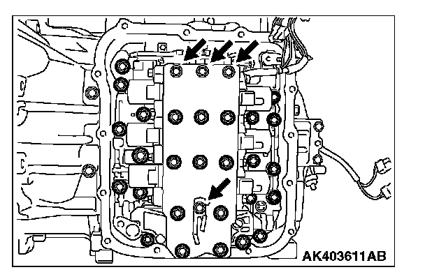 13. Remove the valve body mounting bolts (twenty seven pieces).