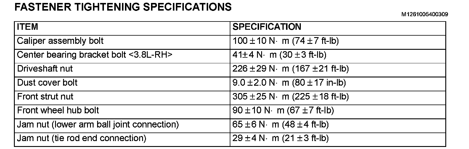 FASTENER TIGHTENING SPECIFICATIONS: