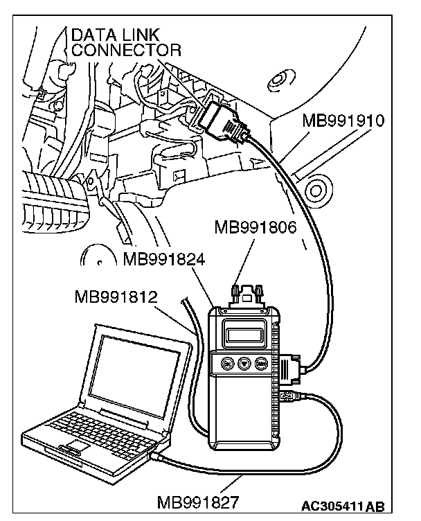 CAUTION: To prevent damage to scan tool MB991958, always turn the ignition switch to the "LOCK" (OFF) position before connecting or disconnecting scan tool MB991958. Connect special tool MB991910 before connecting special tool MB991812. Be sure to connect special tool MB991806 after turning on special tool MB991824.