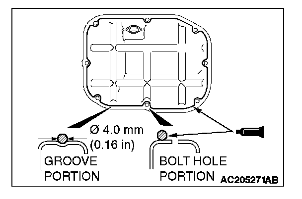 ^ Check the oil pan sealant-coated surface for damage and deformation.