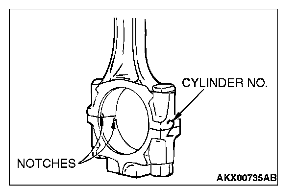 1. Verifying the mark made during disassembly, install the bearing cap to the connecting rod. If the connecting rod is new with no index mark, make sure that the bearing locking notches are on the same side as shown.