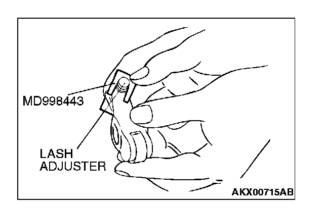 Fit the lash adjuster onto the rocker arm without allowing diesel fuel to spill out. Fit special tool MD998443 to prevent the lash adjuster coming from free and falling to the floor.