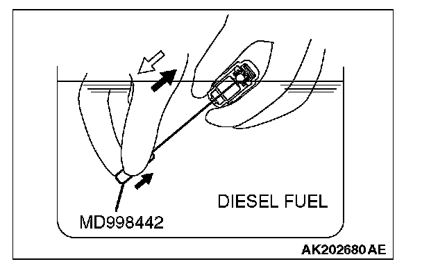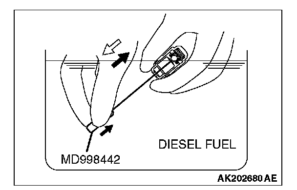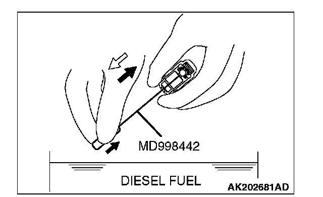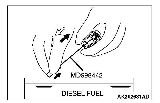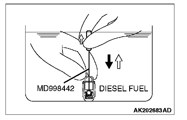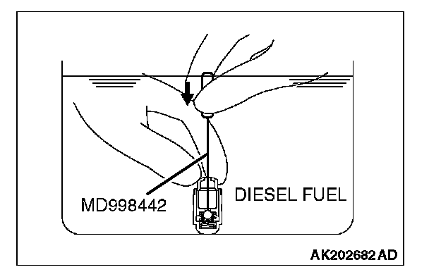 3. While gently pushing down the internal steel ball using wire [0.5 mm (0.020 inch) in diameter] or special tool MD998442, move the plunger through five to ten strokes until it slides smoothly. In addition to eliminating stiffness in the plunger, this operation will remove dirty oil.