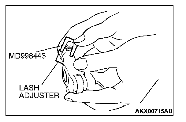 Fit the lash adjuster onto the rocker arm without allowing diesel fuel to spill out. Fit special tool MD998443 to prevent the lash adjuster from coming free and falling to the floor.
