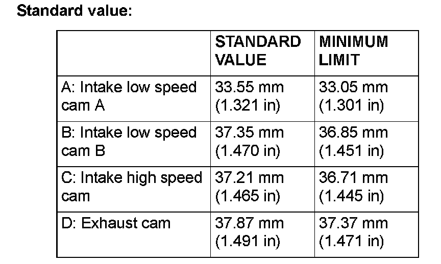 3. Check the cam surface for abnormal wear and damage and replace if necessary. Also measure the cam height and replace if out of minimum limit.