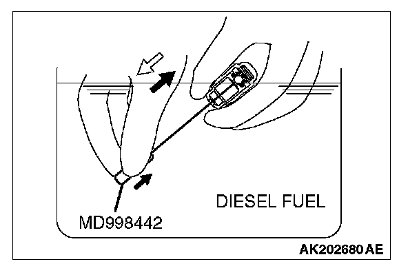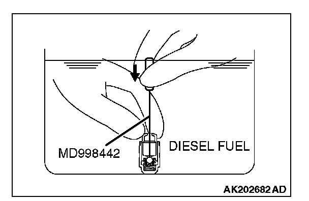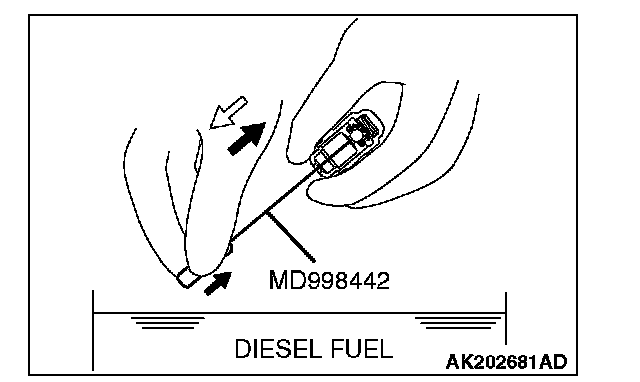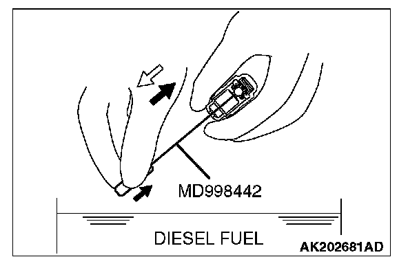 3. While gently pushing down the internal steel ball using wire [0.5 mm (0.020 inch) in diameter] or special tool MD998442, move the plunger through five to ten strokes until it slides smoothly. In addition to eliminating stiffness in the plunger, this operation will remove dirty oil.