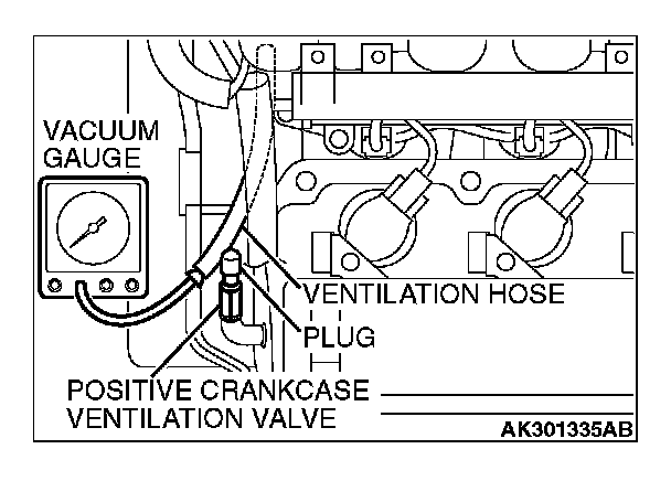 3. Disconnect the ventilation hose from the positive crankcase ventilation (PCV) valve, and connect a vacuum gauge to the ventilation hose.