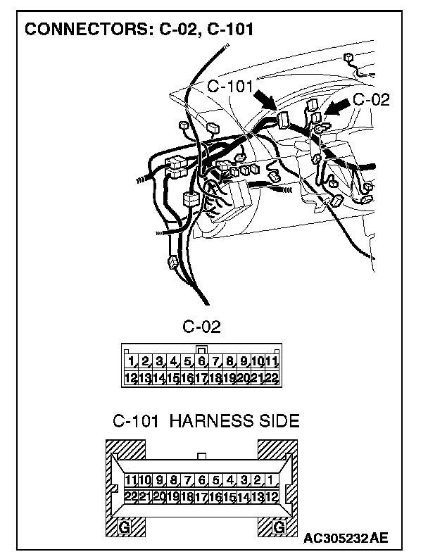 STEP 1. Check joint connector (3) C-02 and combination meter connector C-101 for loose, corroded or damaged terminals, or terminals pushed back in the connector.