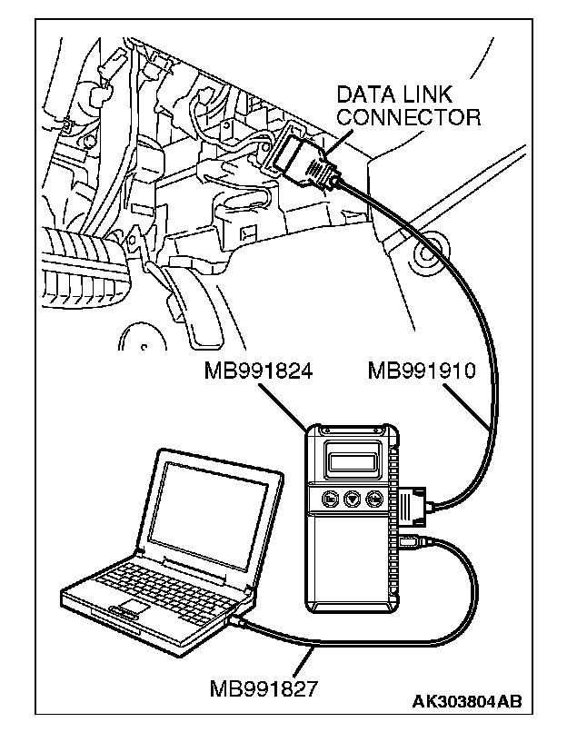 CAUTION: To prevent damage to scan tool MB991958, always turn the ignition switch to the "LOCK" (OFF) position before connecting or disconnecting scan tool MB991958.