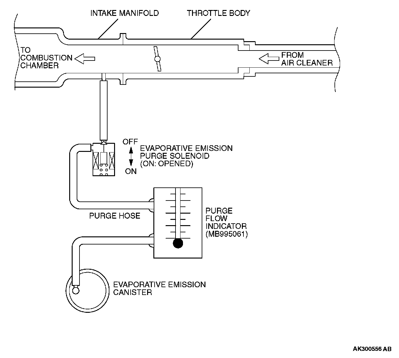1. Disconnect the purge hose from the evaporative emission (EVAP) purge solenoid, and connect special tool MB995061 between the EVAP purge solenoid and the purge hose.