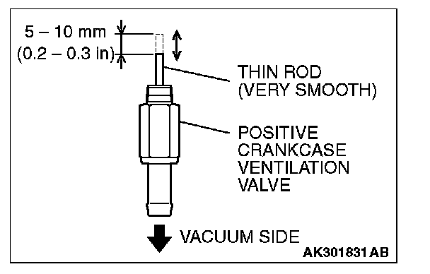 POSITIVE CRANKCASE VENTILATION VALVE CHECK1. Hold the positive crankcase ventilation (PCV) valve with the vacuum side down. Insert a thin rod, and using light pressure, depress the end of the PCV valve spring by 5 - 10 mm (0.2 - 0.3 inch). Release pressure on the rod to see if the PCV valve spring will lift the rod to its original position.