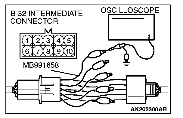 1. Disconnect the intermediate connector B-32, and connect the test harness special tool (MB991658) between the separated connector.