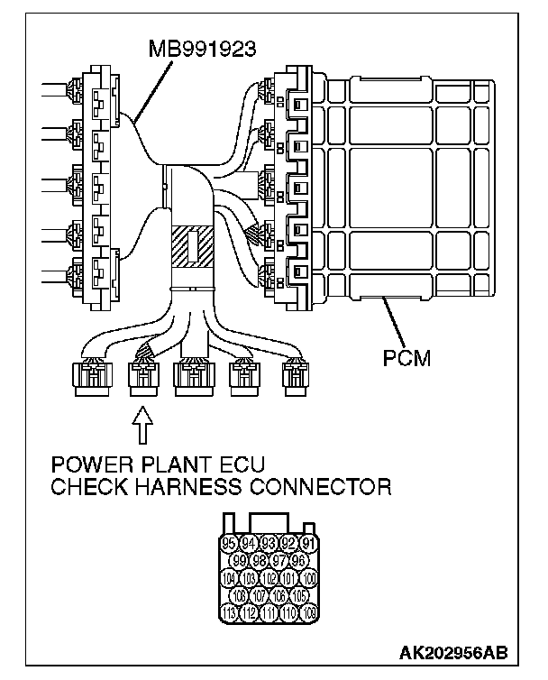 1. Disconnect all PCM connectors. Connect the check harness special tool (MB991923) between the separated connectors.