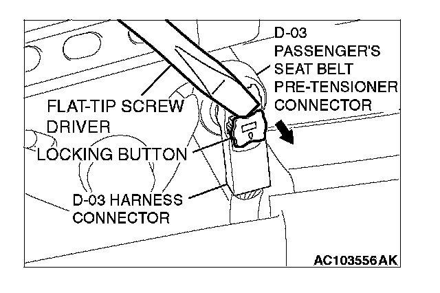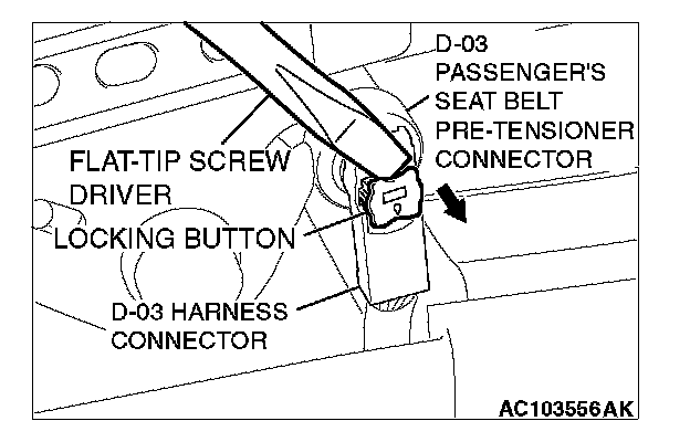 2. Disconnect driver's seat belt pre-tensioner connector D-03. Use a flat-tipped screwdriver to pull out the locking button at the harness connector, and then disconnect the connector.