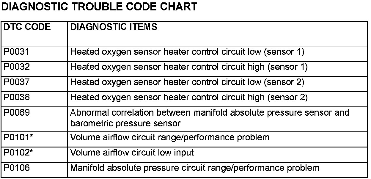 DIAGNOSTIC TROUBLE CODE CHARTP0031 - P0106: