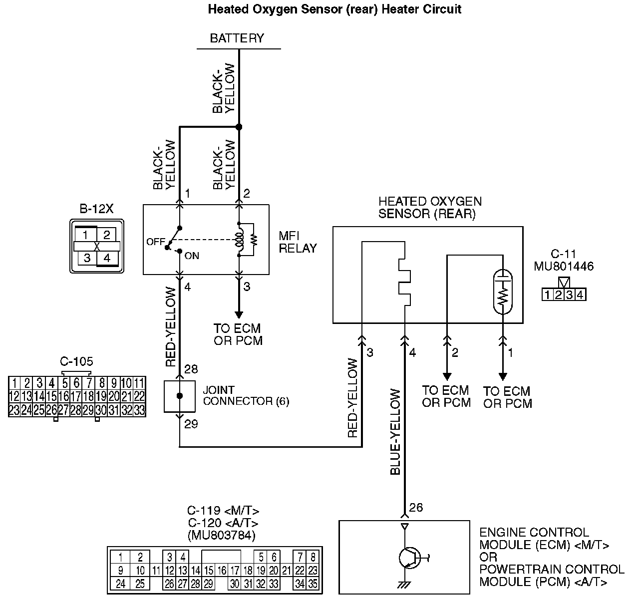 - Power is supplied from the MFI relay (terminal No. 4) to the heated oxygen sensor (rear) heater.